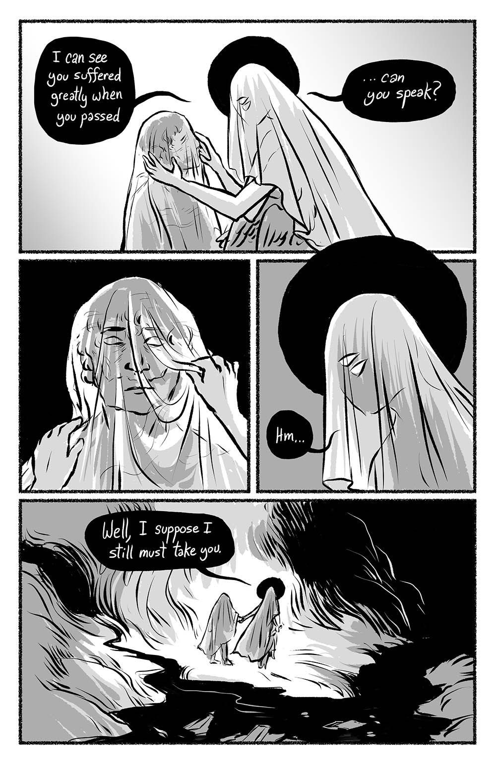A Death angel, accustomed to millennia of human callousness and violence, leads the newest lost soul down to the bowels of Hades. However, this will be a very different journey than all the times before.